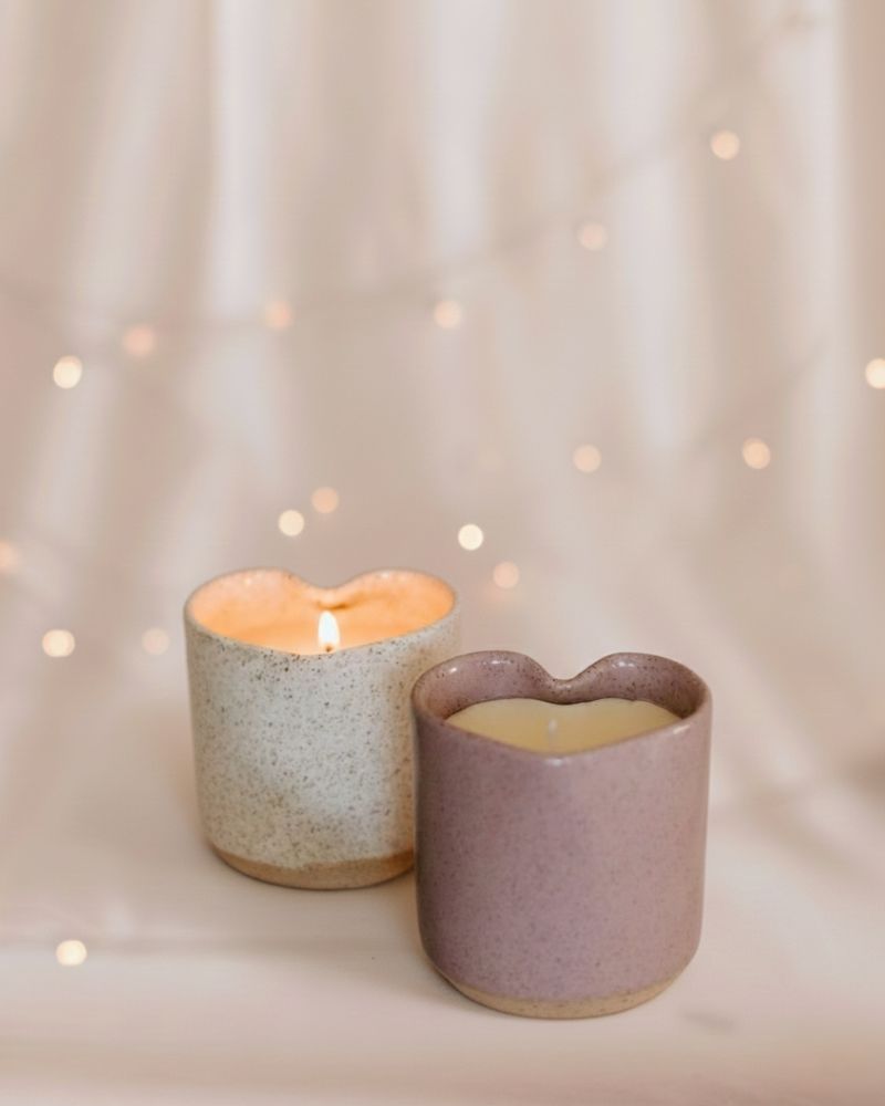 Vela aromática em copo de cerâmica feito à mão com formato exclusivo de coração.