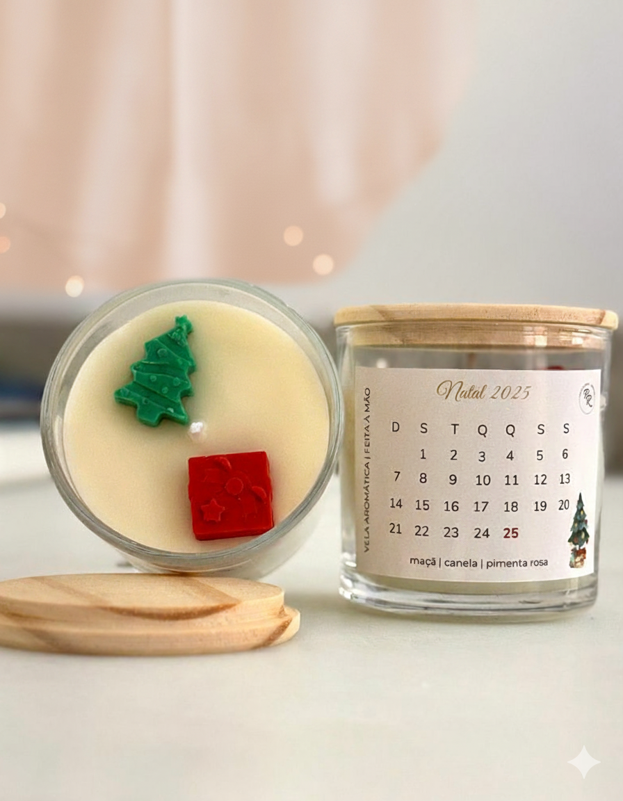 Com símbolos natalinos e calendário do advento no rótulo, é uma peça decorativa e aromática feita com muito carinho.