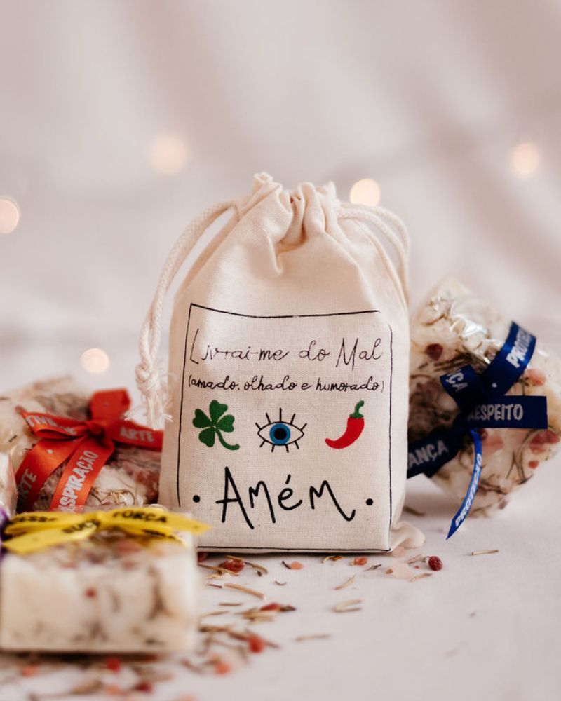 Cada unidade vem em um saquinho de algodão cru personalizado, acompanhado de uma fitinha de desejos, perfeita para presentear ou usar como símbolo de boas energias na virada. Sustentável, sem plástico e 100% reutilizável.